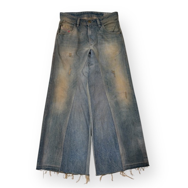WWi.BAGGY DENIM Body:DIESEL ウエスト:約84cm わたり:約32cm 股上:約32cm 総丈:約97cm DIESELのジーンズを解体、再構築しました。 全体に軽くダメージ加工を施し、一本ごとに異なる表情を持たせています。 ベージュの染料を使用し染色加工を施しました。 ONE OF A KIND.