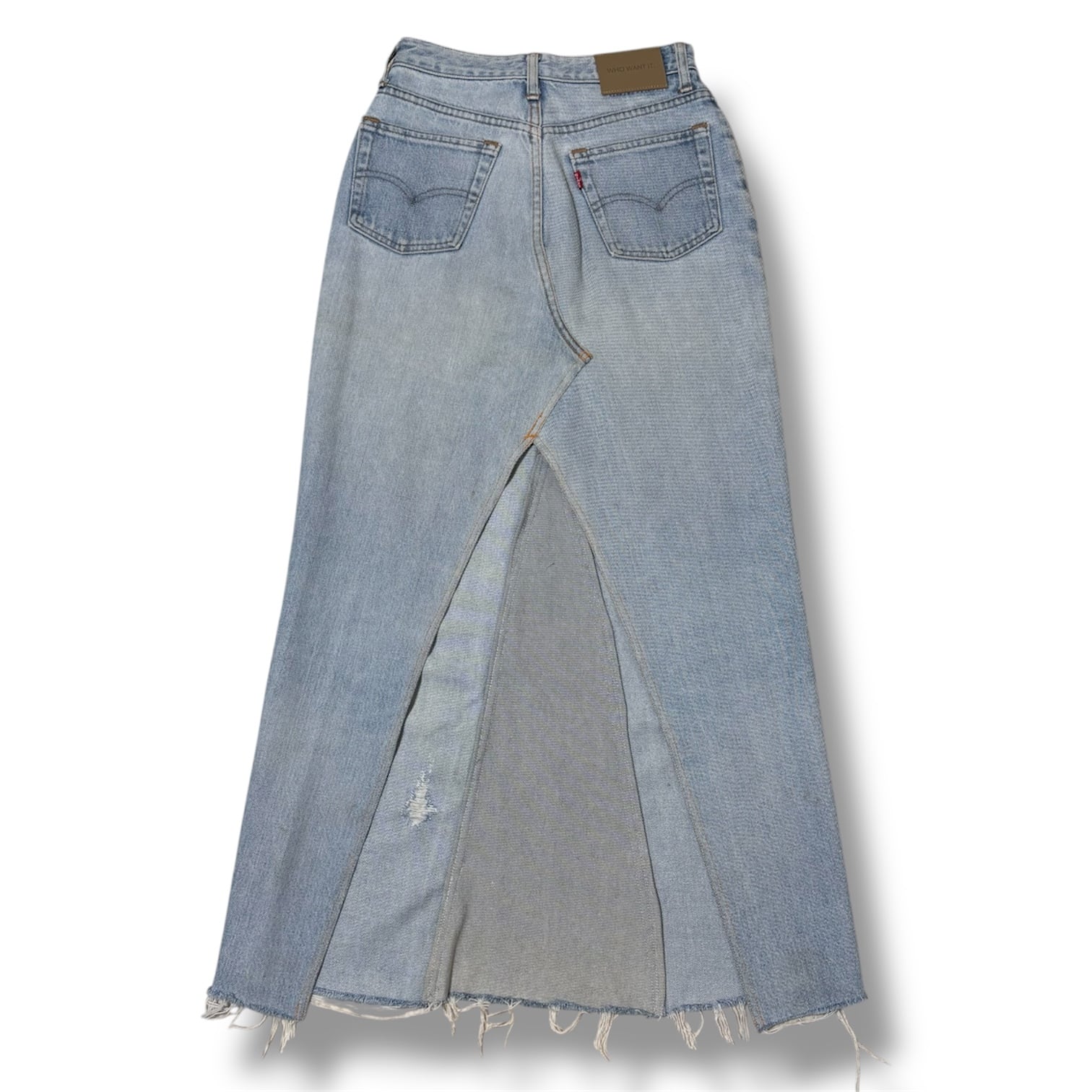 ヴィンテージリーバイスデニムを解体し、ロングスカートに再構築後、ダメージ加工を施しました。